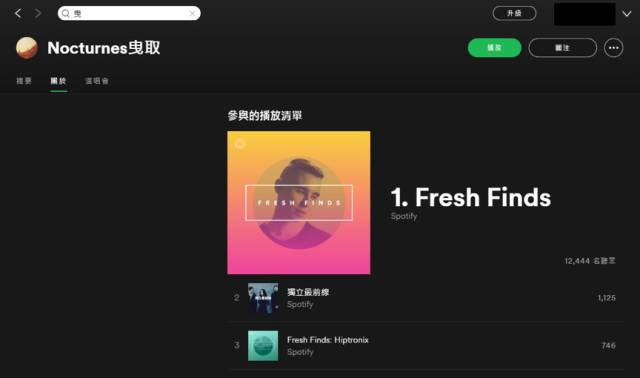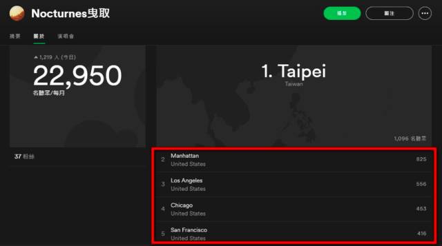 图为 Spotify 台湾地区页面显示的北美城市听众数