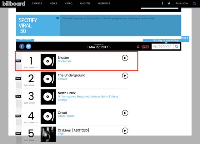 Spotify Viral 50 榜单不同于 Top 50 榜单,它所记录的是歌曲分享数与在社交网站上的活跃度。《Shutter》跨越地区界限,在北美地区的听众间累积口碑,成为2017年5月21日至27日的冠军。而这个时间点,距离 Nocturnes曳取新单曲全球首发不过才两周时间。