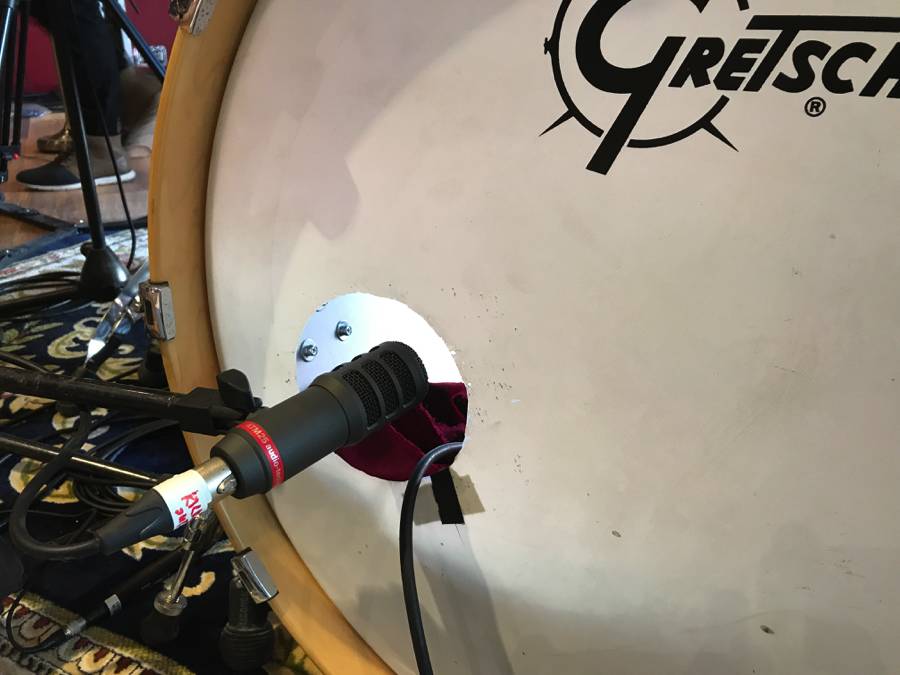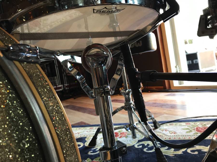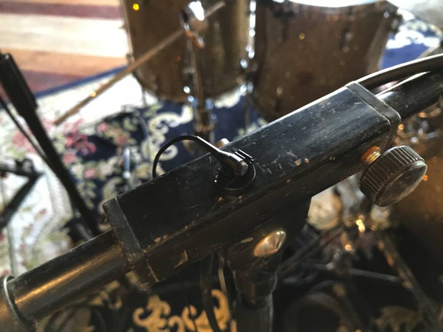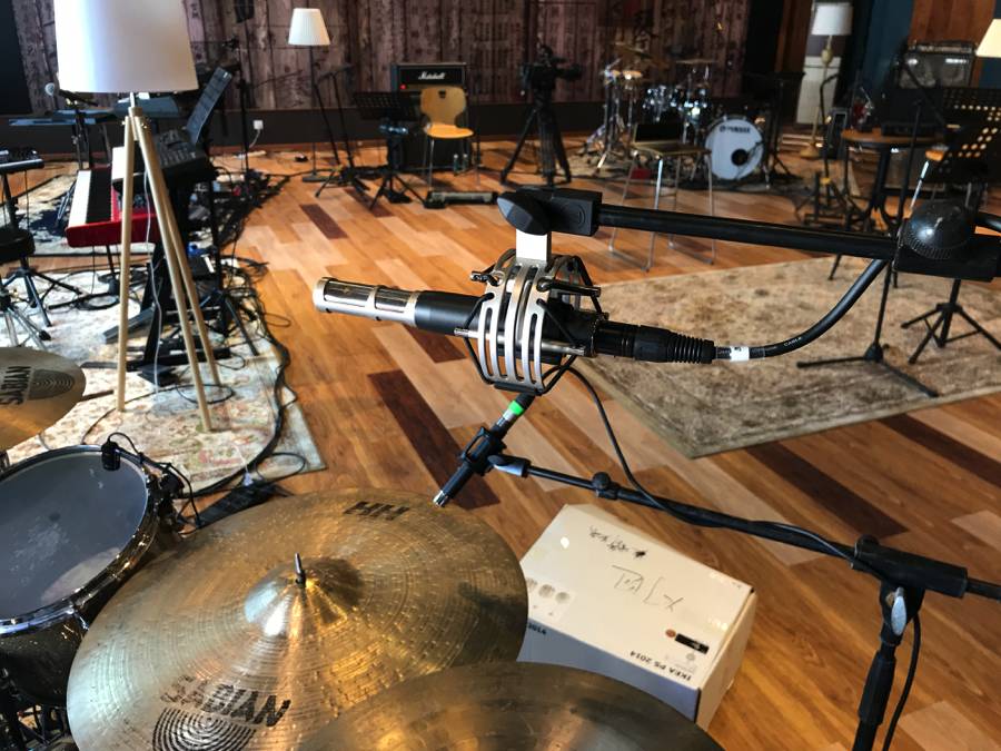 接下来说说其他乐器上使用的话筒吧!这次在剑青的乐队鼓组上,是以Audio-Technica的麦克风为主进行拾音。Kick选择了我钟爱的ATM-25、Snare Top使用了ATM-230、Snare Bottom则是DPA 2011c、Toms选用了ATM-350a、Hihet用的是AT-4051b、OH用的是高频表现非常细腻的AT-5045P、Ride则用的是Telefunken M60。这里要特别提到用在Toms上,即将面市的ATM-350a。新设计的鼓夹不仅能够牢牢的固定在鼓上,而且上面还附带鼓锁,当鼓手要调鼓的时候,可以不需要将麦克风撤掉。话筒杆也比之前的更加粗实,还可以不同角度方向来固定,非常好用。冲着这样的设计,不管音质怎样,着实也有想要拥有的冲动。不过当然音质上的表现当然也是非常好的,不然我怎么会用呢,呵呵!当然它和DPA 4099系列话筒一样,有着各种乐器的固定夹子,非常好用。