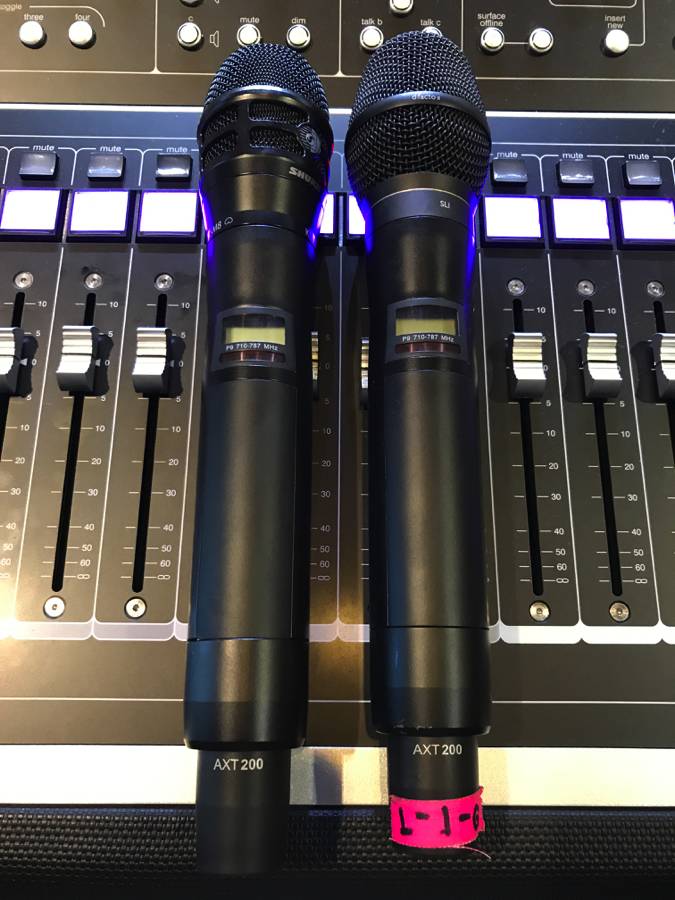 艺人使用的话筒部分呢,不同于去年,由于艺人要求使用无线话筒,方便于现场走动。大家都知道,无线的信号传输,远远不及有线的传输。为了声音达到极致的要求,这次特别选用Shure旗下的顶级Axient AXT-400无线传输系统以及AXT-200无线手持,搭配上Shure KSM8和DPA d:FACTO II话筒头。在这种充满电子设备的密闭空间里,无线频率往往十分混乱。Axient自动切换主备频率的功能能够充分面对干扰,提供稳定的传输和堪比有线话筒的高品质音质。