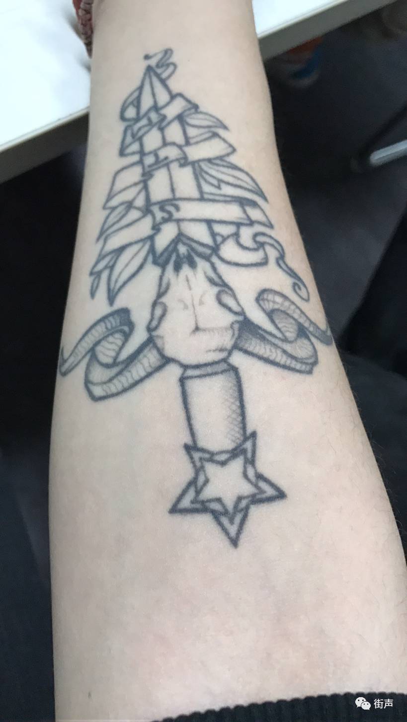 很早的时候就觉得纹身特别好看,一直有纹身的想法,后来终于一咬牙实现了哈哈。第一个纹身是两年前,小臂内侧纹了个匕首形状的图案,和我们公司高校摇滚夜的英文缩写“STM”,其实就是百度上找的图片改的,没有太关注内容,就想着赶紧纹,迈出第一步哈哈哈。