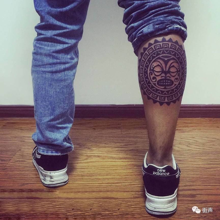 另一个是今年一月份纹的“太阳图腾”,其实我是个很迷信的人,算命的跟我说:“你就适合太阳图腾和木头的饰品”,我在网上找好图案之后让季秋洋的朋友帮我纹在左脚小腿上,之后接二连三的好事就发生了。我们彝族是个崇尚火和太阳的民族,太阳给万物带来光明和温暖,照进每个人心里最阴暗的地方。