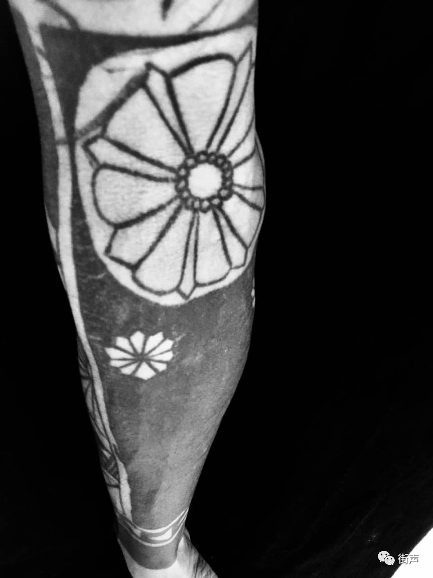 最早有这个念头是在大学,那时候刚刚接触纹身,觉得特别酷,就把我第一个乐队“小熊饼干”的英文,纹在了小腿上。我身上的纹身还挺多的,我养的猫咪、我妈妈的属相——一只母鸡。三十岁的时候还纹了30的图案,每个都有或大或小的意义。一直很想拥有花臂,对我来说是个小小的梦想,也是做摇滚音乐的态度。