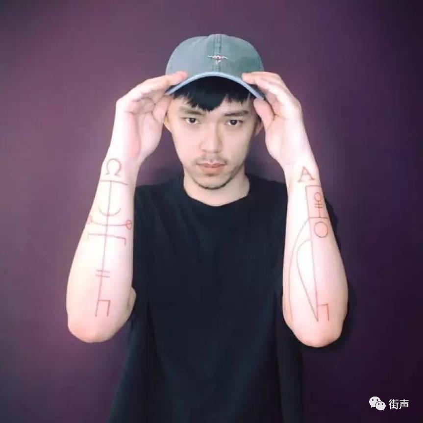 我现在有八个纹身,我腰上的纹身是中文字,在18岁不懂事的时候刺了一个安静的“静”。然后其他的纹身好像都跟神秘学有关,左手这两个是塔罗牌,英文字就是α和 Ω,就是第一个字跟最后一个字,其实有的时候也被用到基督教里面。脖子上的纹身是我自己设计的,把它想象成我跟宇宙之间的,好像星球的关系。两个最新的是冰岛的符文,我去年2月底去伦敦工作,顺势在冰岛买了一本书。整本书都是冰岛的符文,因为可能冰岛人的祖先是维京人,有时候他们需要信仰一些宗教力量的,所以我就选择了两个喜欢的符文,刺在手上。(来自乐童在《大事发声》后对 HUSH 的专访《把“天文学”和“哲学”双修成歌》)