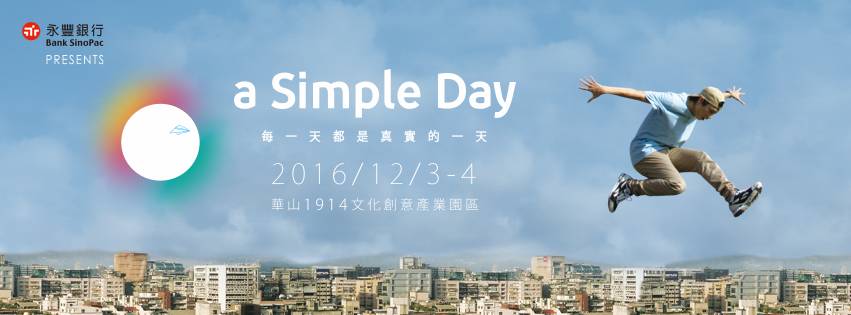 当简单生活的样貌已在心里扎根,接下来的每一天都是真实的一天。继2015首度前进台中新市政公园,今年的简单生活节回到老地方华山1914文化创意产业园区举办,并正式转型为“a Simple Day 简单的一天”。两天活动现场吸引将近五万人次的参与,除了一系列的音乐演出,也邀集许多新创手作品牌、小农市集以及各种跨界合作参加,让音乐和创意融入生活,让创作者与热爱者在其中相遇,彼此扶持成长。