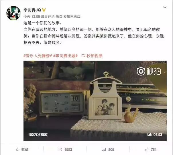 截至5月23日,李剑青《出城》MV 在新浪微博话题关注达2000万,微信指数也在五天内从180飙升至12k+,仅在微博秒拍视频,MV 播放量已突破百万。