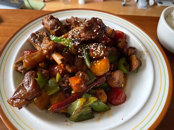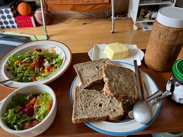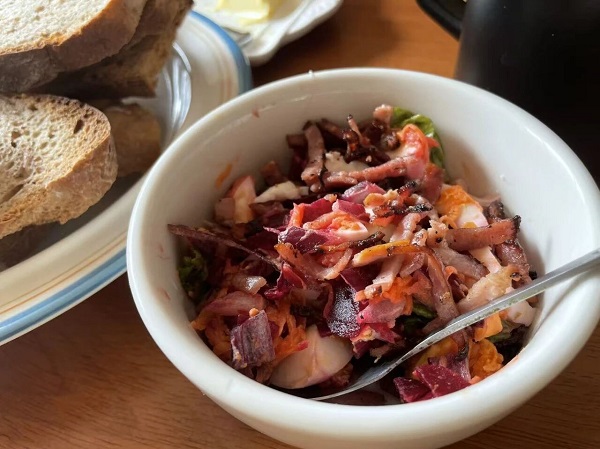 通常我的一天从一盘沙拉和恰巴塔开始。沙拉里有番茄丁、洋葱碎、牛油果丁、甜菜丁、生菜块和胡萝卜碎。恰巴塔是手工做的很方便,空气炸锅就能做。我之前从来没有吃过甜菜,是男朋友妈妈推荐的。今年夏天在法国我们一起生活了一个月,每天早上都会吃。法国那边有卖塑封好的熟甜菜,回来之后就在网上买,煮好冷冻,每次取用一部分。味道甜甜的,对肠胃好,后来我甚至不怎么痛经了。这个神奇的沙拉,就成了家里固定的早餐环节。那段时间还尝到了一个叫 Bo Bun的米粉,超级好吃!上面的小料很丰富脆脆的。还有柠檬味的冰淇淋,以及当地人好像不吃鱼皮——不知道为什么,我还挺喜欢吃鱼皮的。