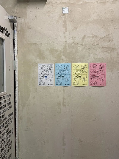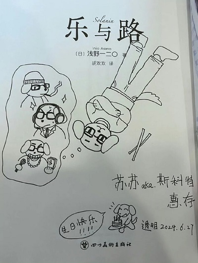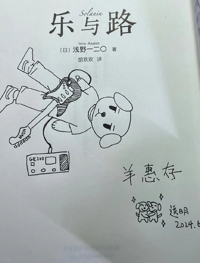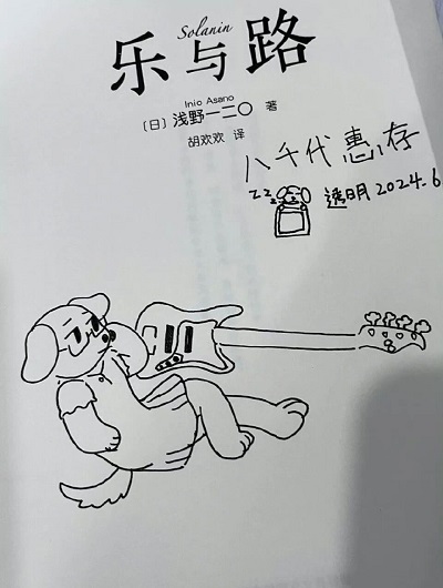 “第一次知道《乐与路》,是透明送了我们三个每人一本原作漫画,扉页还有他手绘的我们。”毕业离校的日子,透明把三本《乐与路》漫画装进书包,冒着雨带给另一座校园里的三位伙伴。“雨水把漫画淋得皱巴巴的”,他用可爱的笔触在扉页画下了另外三人的卡通形象。正好赶上鼓手斯科特生日,透明小心翼翼地在右下角“惠存”下画上了端着生日蛋糕的小狗。