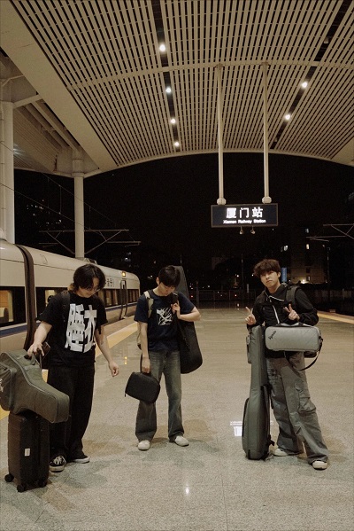 这是乐队第一次去比杭州更往南的地方演出,为了省下每人80块钱的路费,夜晚做决定四个人正坐在长达七个小时的动车上。窗外一片苍翠正如乐队伙伴们经常一起去的杭州虎跑公园,烟雨濛濛也许是南方沿海城市的常态。
