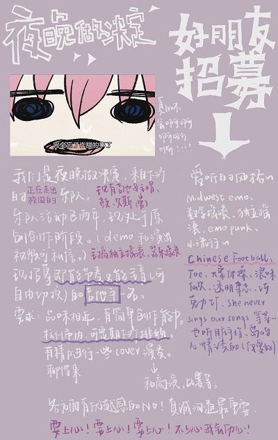 后来吉他手小乐毕业选择专心工作,剩下的三个人选择继续走原创的道路,也开始找新的伙伴加入。“我们当时做了一个小海报招人,有很多朋友帮我们转发。期间也有两个朋友帮我们客座演出过,但始终没有找到很适合的人选。”本以为最后一块拼图就这样放弃,某天在b站上闲逛的八千代看到了一个cover ANORAK! 的视频,对方的IP刚好在浙江。她抱着试一试的态度去私信,网线另一端的那个人就是透明。