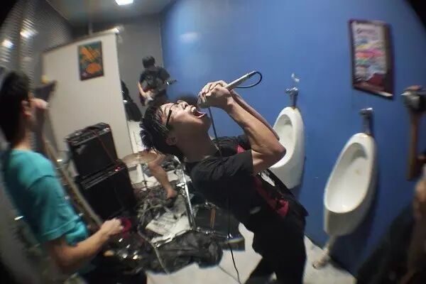 2010年9月30日,瑞典后摇乐队 Pg.lost 在广州的黑铁时代演出,人品问题和另一个乐队“巴黎”在黑铁时代的厕所里演(图片来源:人品问题豆瓣小站)