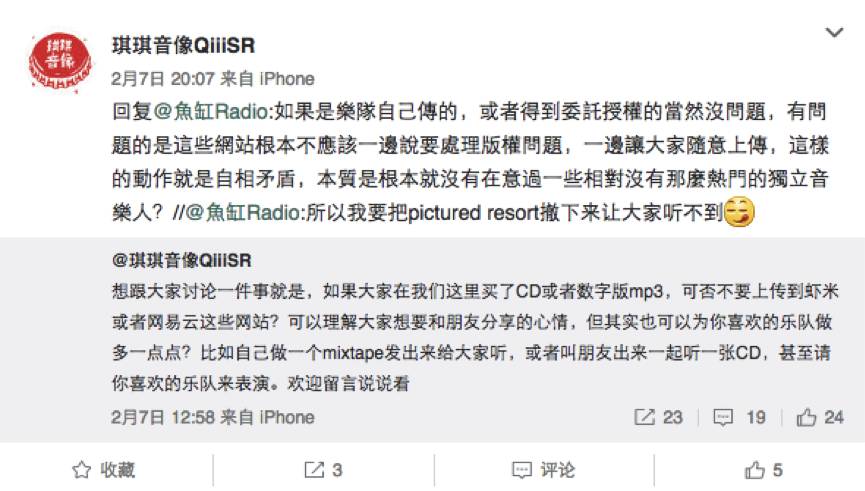 此前,就音乐平台的使用问题,琪琪音像在微博进行了小范围的讨论