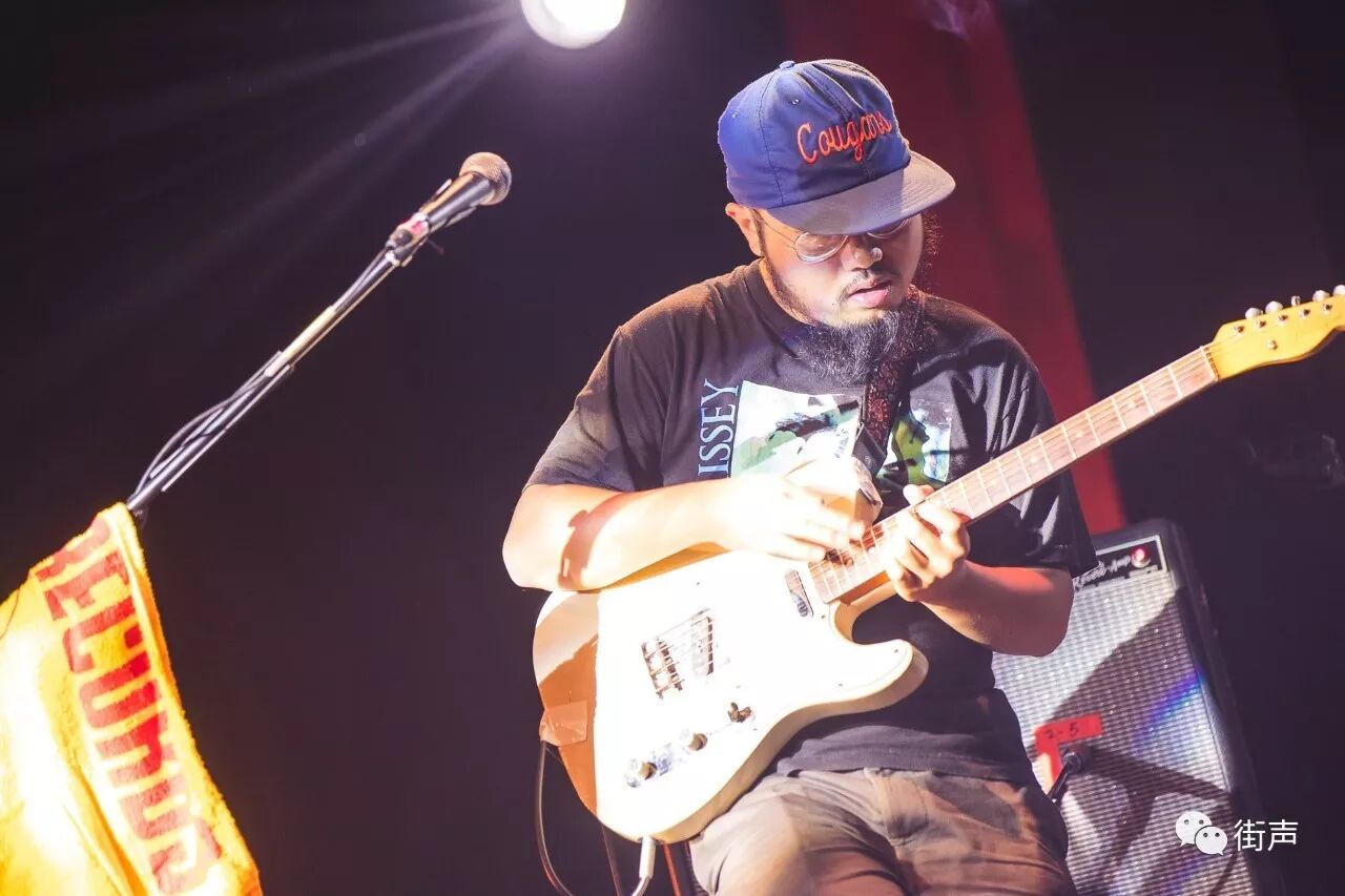 贝斯手李立鑫戴一顶花花的渔夫帽来,上台前却摘掉了