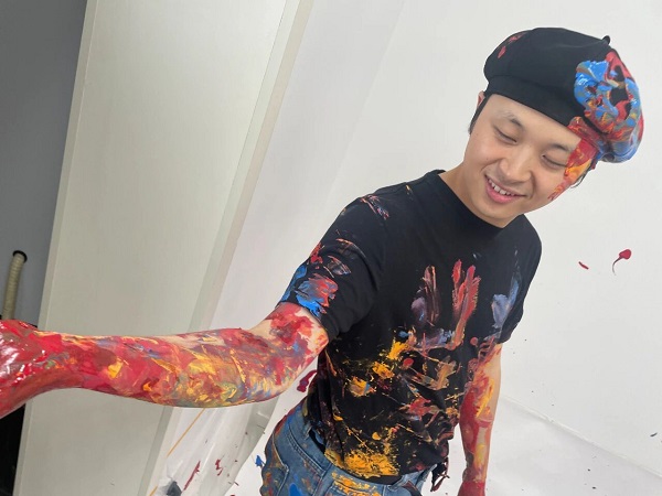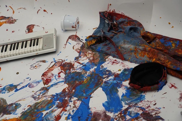 贺铭洋:第二天我们把李烦家的地下室搬空,铺上白色的牛皮纸,随便泼颜料,拍《烤箱》的MV。本来还有另一条故事线,但是那天拍完地下室的部分我们就都歇逼了,要不就先这样吧,后面再看要不要再拍。直播的时候我们一直在地上铺纸,小红书警告我们这样屁股冲着观众是“消极直播”。