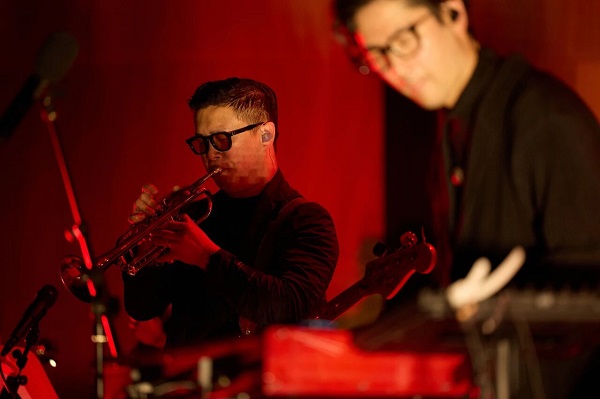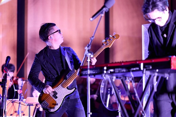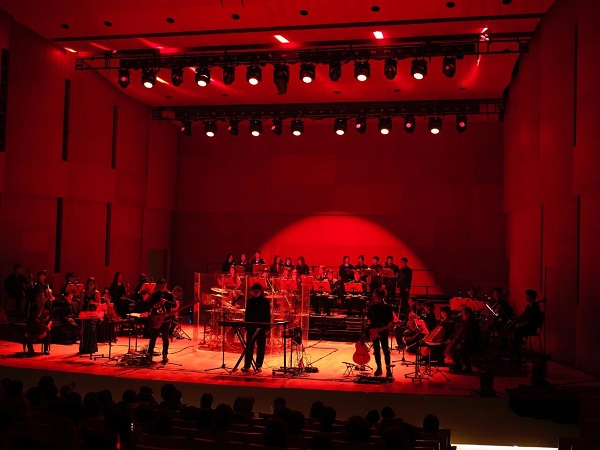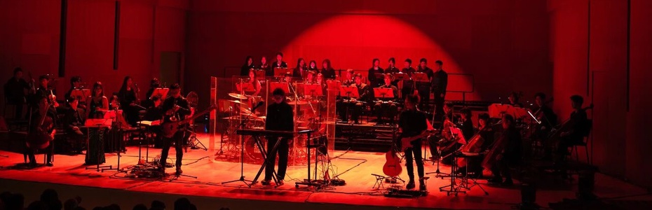 时间来到《江湖》和《恢弘的大梦》,前者大提琴音色深沉,时间、情爱、悲欢离合在戏曲和管弦乐的融合中释放;后者在极其安静的氛围里悄悄流淌开来,大红色的灯光装扮成海上的日出,钢琴犹如缓步走下台阶,现场的音响将京剧采样调整声相,传统与现代从两个方向分别向我们走来。镲的演奏将独具特色的中国鼓带入,吉他手在此时悄悄换上了古典吉他。琴弦、指板与手指相互接触发出摩擦的痕迹经由箱体放大,像枯槁的船桨也像生锈的船锚,在提琴和长笛的荡漾下轻轻被埋没。