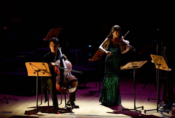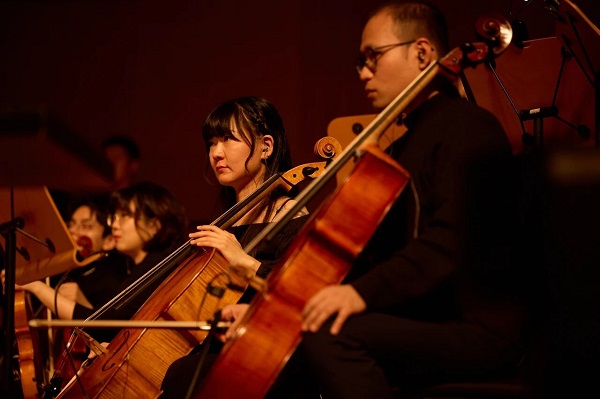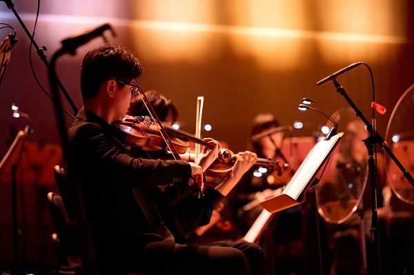 《老友》这首穿越十年光阴的作品,是耳机里熟悉的海风声,是一段独奏后全体声部错落有致的齐鸣,陪伴十年来的人们度过一个又一个失眠的夜晚。由《烟火》飞向《夜空》,李星宇通过钢琴投出一段旋律,小提琴旋即用另一段来回应。灯光变幻,映照在天花板上看上去像暖色调的极光。