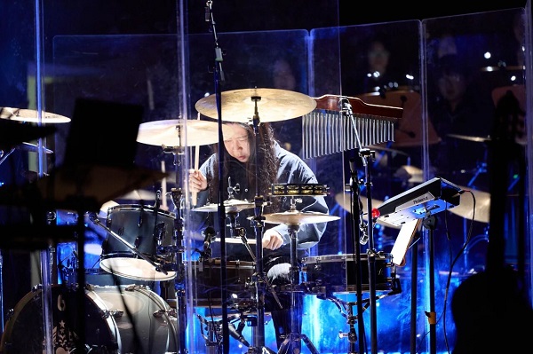 单簧管在《波兰火车》的演奏中加入。灯光在屏幕上演绎着VJ视觉,黑色背景因为温暖的单簧管音色而被投下了黄色的斑驳。视觉上让人想到秋天松脆的落叶,在冬日到来之前感受到最后一缕温馨。“第一次来到国图,第一次来到这么大的场地。第一次七十个人一起吃麦当劳。”大阵仗的专场准备过程格外辛苦,却也让李星宇觉得幸运而不可思议。talking 桥段刚结束,人数最多的演出环节就要上演了。鲸鱼马戏团的全体成员、442交响及重奏乐团、绿洲声觉合唱团。几十人将舞台区域准确划分,位于中心的架子鼓组被鼓盾坚实守护。
