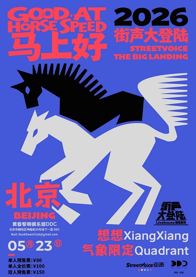 双拼的惊喜即将降临街声大登陆马年特别版北京站:一边是擅长关心人事物、玩遍谐音梗、比三分钟热度多一分的天团 想想XiangXiang,一边是活跃于北京大小场地,社交媒体嗅觉灵敏,灵气穿过水、光影与晨曦的 气象限定Quadrant。朋友们齐聚熟悉的黄昏黎明俱乐部DDC,给你一种特别的“周末感觉”。