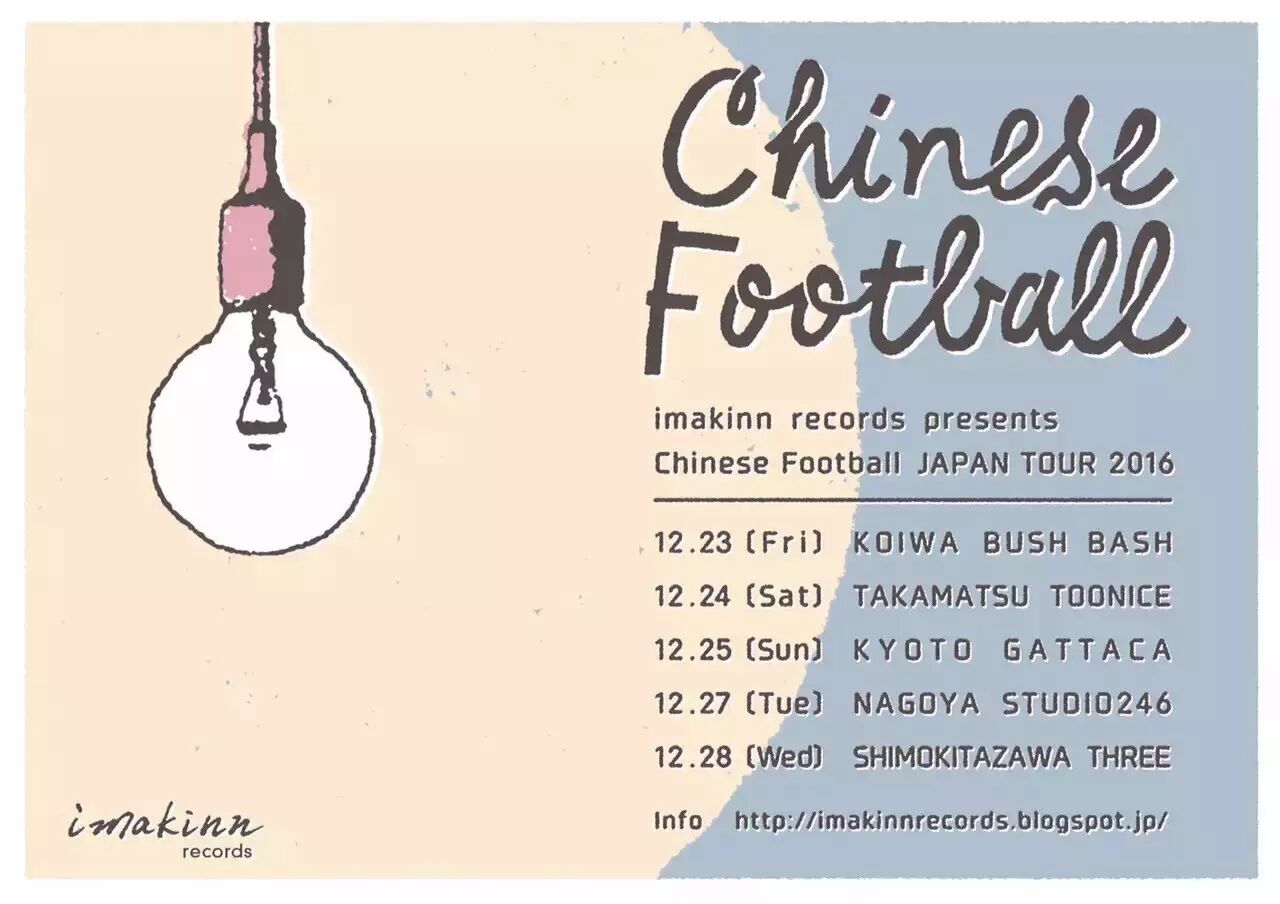 其实,徐波还没到日本游学的时候,《Chinese Football》这张实体CD已经在东京知名连锁唱片店 Diskunion 出售。当时找他们采购的日本人叫 Yoshitaka Imazeki,在 Diskunion 上班,负责朋克类独立乐队采购,业余也运营一间自己的小厂牌 imakinn records。射手座的 Yoshitaka 跟白羊座的徐波很合得来,在彼此还是网友的情况下,就眼疾手快帮 Chinese Football 攒了五站日本巡演。